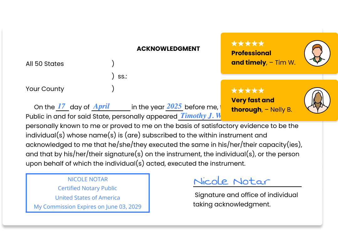 Our mobile notaries are certified, experienced and ready to handle everything from real estate documents to powers of attorney. They know local notary laws inside and out and focus on making the process smooth, accurate and stress-free.
