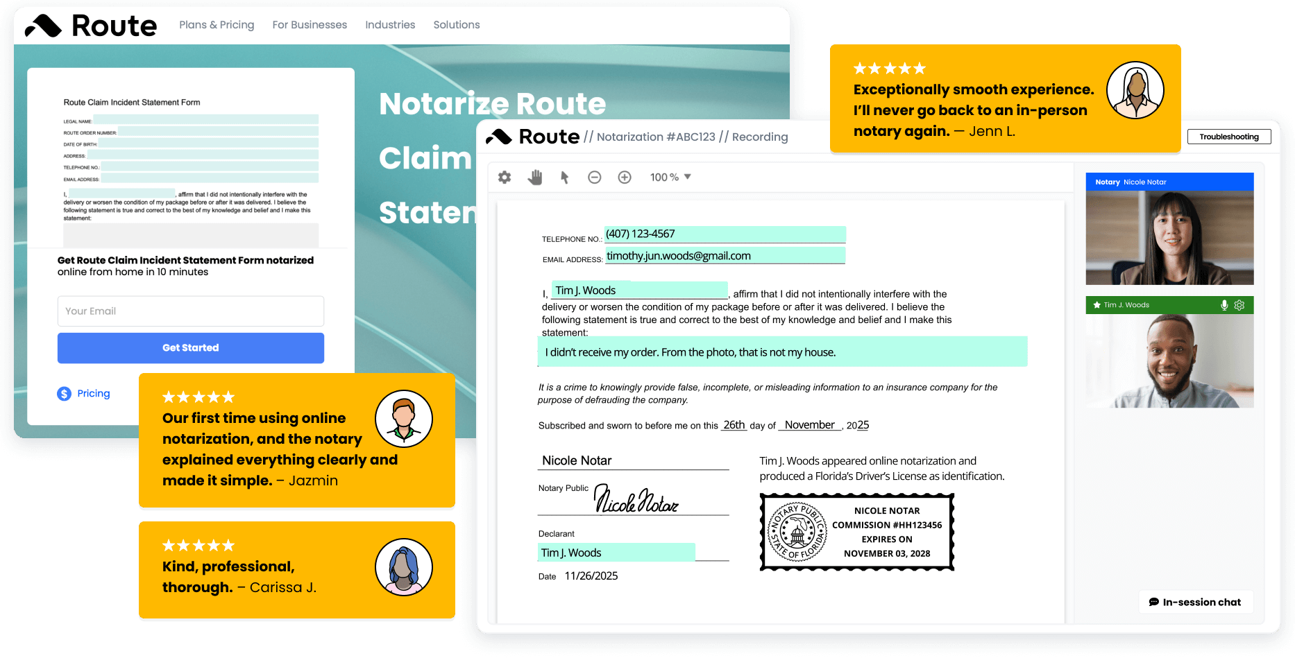 40% reduction in fraud.Major lift in CSAT. Route embedded OneNotary into its claims workflow, enabling customers to complete their process in minutes.